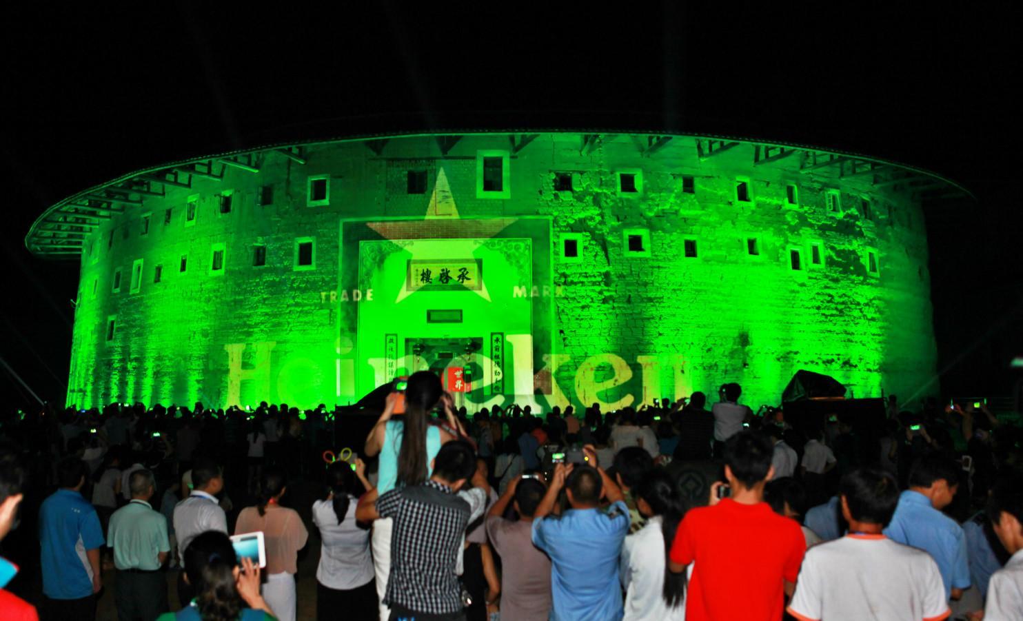 決賽當(dāng)天,近三百名球迷們抵達(dá)歷史悠久、規(guī)模宏大的福建龍巖永定土樓,一起登樓遠(yuǎn)眺,而精心準(zhǔn)備的“發(fā)現(xiàn)土樓星視覺”攝影比賽、優(yōu)雅傳統(tǒng)的茶道和古箏迎賓表演,也將熱情獨(dú)特的客家風(fēng)土人情一一展現(xiàn)在球迷面前。當(dāng)夜幕降臨,喜力啤酒的Logo以裸眼3D的形式投影在“土樓之王”承啟樓墻體,開啟華麗璀璨的裸眼3D秀,瑰麗的視覺效果與氣勢恢弘的土樓交相輝映,瞬間點(diǎn)燃全場球迷的激情,2013喜力歐冠決賽觀戰(zhàn)夜震撼開場。