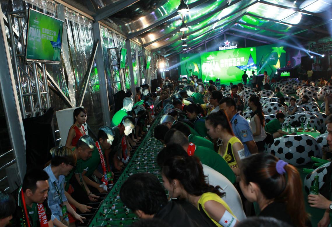 在決賽開始前,喜力啤酒更準(zhǔn)備了精彩的表演和豐富的互動節(jié)目。主舞臺上熱力四射的表演贏得了在場球迷的陣陣歡呼,在臺下的擂臺區(qū),喜力桌上足球歐冠賽的全國總決賽也鳴槍開戰(zhàn)。分別來自大連、廣州、長春、廈門、常州及去年衛(wèi)冕冠軍廣州隊(duì)的六支隊(duì)伍的好手奮力廝殺突出重圍,觀戰(zhàn)的球迷也激情助力搖旗吶喊,最終衛(wèi)冕冠軍廣州隊(duì)在開場不利的形勢下反敗為勝,蟬聯(lián)2013年度桌上歐冠賽的總冠軍,贏得壹萬元現(xiàn)金大獎。而場地內(nèi)另一個(gè)聚焦關(guān)注的大亮點(diǎn),當(dāng)屬長達(dá)40米的喜力桌上足球賽球桌,即時(shí)啟動的桌上足球挑戰(zhàn)賽,容納50對50人同場競技,PK挑戰(zhàn)無極限,百人對戰(zhàn)的宏大場面將賽前活動推向另一個(gè)高潮。