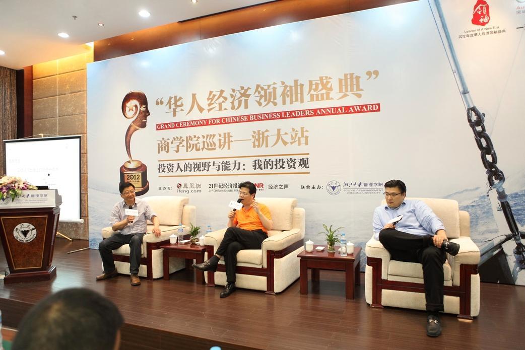 北京2013年5月27日電 /美通社/ -- 5月24日下午,在浙江大學(xué)紫金港校區(qū)啟真湖畔,一場(chǎng)商界領(lǐng)袖與青年精英們的風(fēng)云對(duì)話(huà)進(jìn)行得如火如荼。值浙江大學(xué)建校116周年之際,由鳳凰網(wǎng)、《21世紀(jì)經(jīng)濟(jì)報(bào)道》、中央人民廣播電臺(tái)經(jīng)濟(jì)之聲主辦的“華人經(jīng)濟(jì)領(lǐng)袖盛典”商學(xué)院巡講走進(jìn)了浙江大學(xué)管理學(xué)院,與位于經(jīng)濟(jì)前沿的浙江大學(xué)管理學(xué)院的學(xué)子們激蕩思想,分享經(jīng)驗(yàn)。