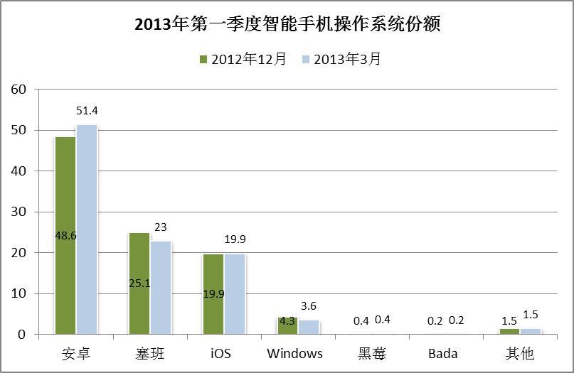 Kantar Worldpanel移動通訊消費(fèi)者指數(shù)的連續(xù)性研究發(fā)現(xiàn),第一季度安卓系統(tǒng)在整體智能機(jī)市場的份額上升至51.4%,環(huán)比上升2.8%。這是安卓系統(tǒng)第一次在中國正式占有超過半數(shù)的智能機(jī)市場,而二,三位仍然是塞班和iOS系統(tǒng),市場份額分別為23%和19.9%。較2012年第四季度,塞班系統(tǒng)的市場份額下降了超過2個百分點(diǎn),但iOS保持不變停留在將近20%的市場份額。按照趨勢推測,在2013年第二至第三季度中,安卓將會繼續(xù)擴(kuò)大在智能機(jī)的主導(dǎo)地位,塞班則將讓位給iOS退為第三大智能機(jī)操作系統(tǒng)。