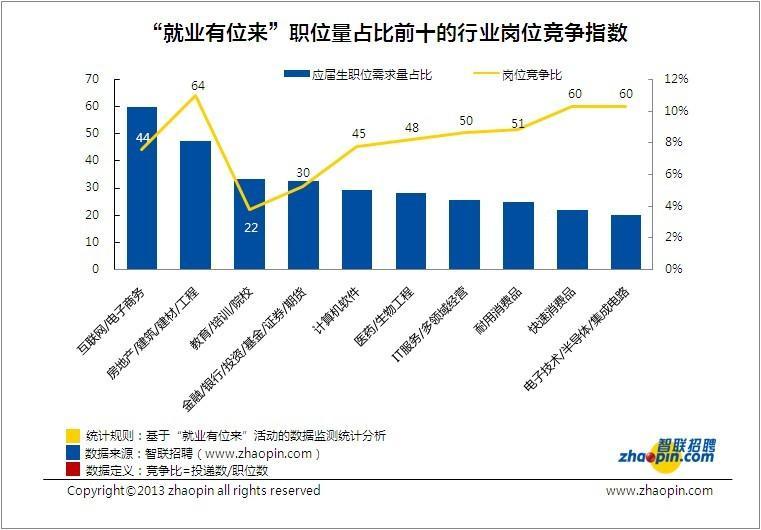 智聯(lián)招聘對“就業(yè)有位來”發(fā)布的崗位從城市分布、行業(yè)分布等角度進(jìn)行了數(shù)據(jù)分析。結(jié)果顯示,互聯(lián)網(wǎng)/電子商務(wù)行業(yè)崗位需求量猛勁,居46大行業(yè)之首。該行業(yè)職位量占全部行業(yè)職位的10%,居首位。但崗位競爭指數(shù)并不樂觀,居中等偏下的位置。深入分析互聯(lián)網(wǎng)/電子商務(wù)行業(yè),發(fā)現(xiàn)民營企業(yè)的職位量占比高達(dá)61%。智聯(lián)招聘《2013大學(xué)生就業(yè)形勢報(bào)告》指出,受規(guī)模、知名度等影響,應(yīng)屆生對于“皇糧”的熱衷程度依舊居高不下。而民營企業(yè)的急速擴(kuò)張導(dǎo)致對人才的需求量也在不斷上漲。但落花有意流水無情,求職者對于民營企業(yè)的崗位并不熱衷。這也是導(dǎo)致互聯(lián)網(wǎng)行業(yè)人才難求的原因之一。