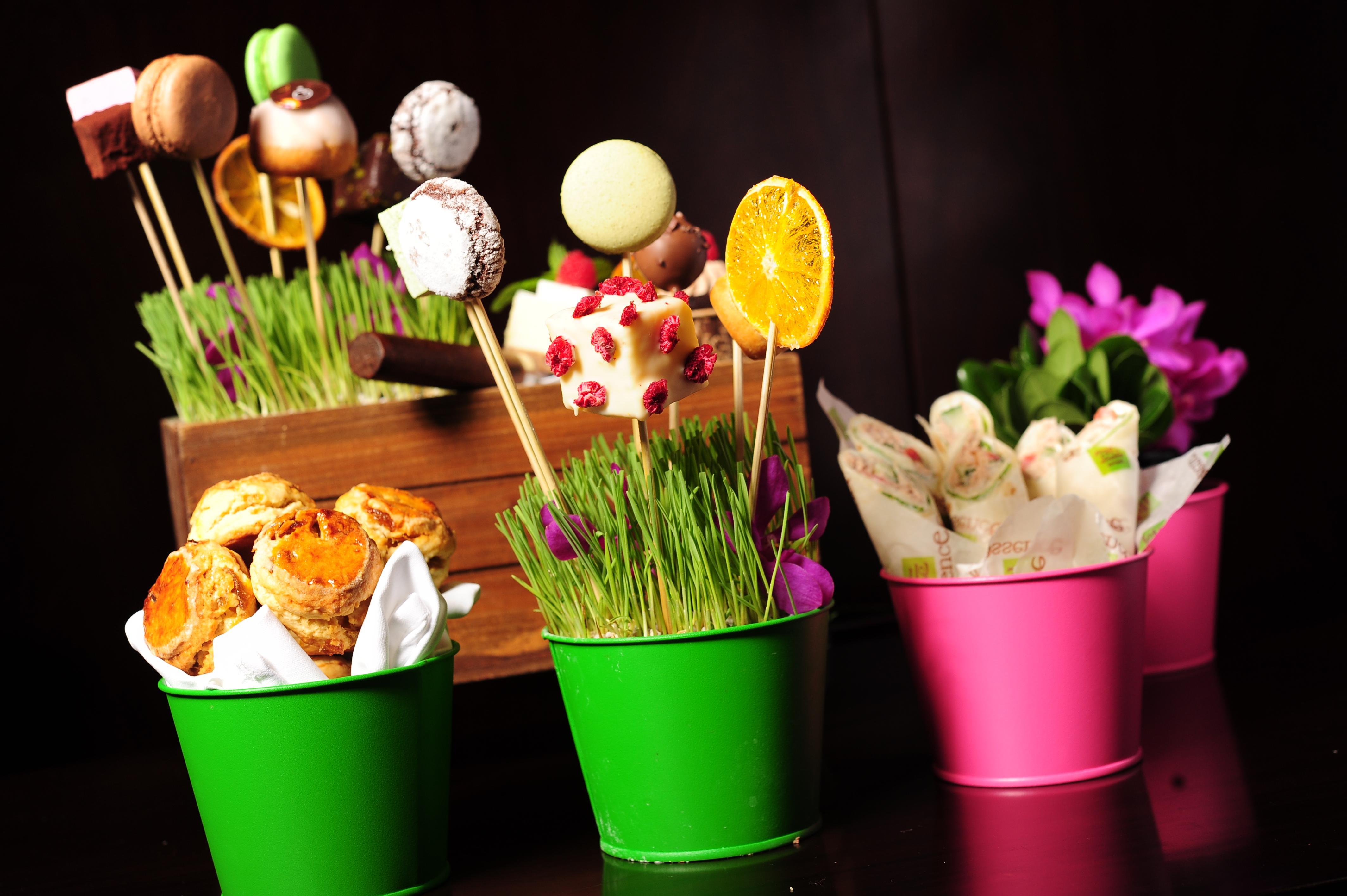 亞洲甜品大師Cary將創(chuàng)意與美味相結(jié)合,告別了傳統(tǒng)英式下午茶的傳統(tǒng)模板,注入新潮、自由的獨特元素。飄著清香松木味的可愛小推車,細膩潔白的小石頭,還有碧綠清新的小麥草,給您撲面而來的清新。點綴的小花旁,誘人的甜品如同可愛的棒棒糖般豎立著,讓食客瞬間回到童年的甜美記憶中。