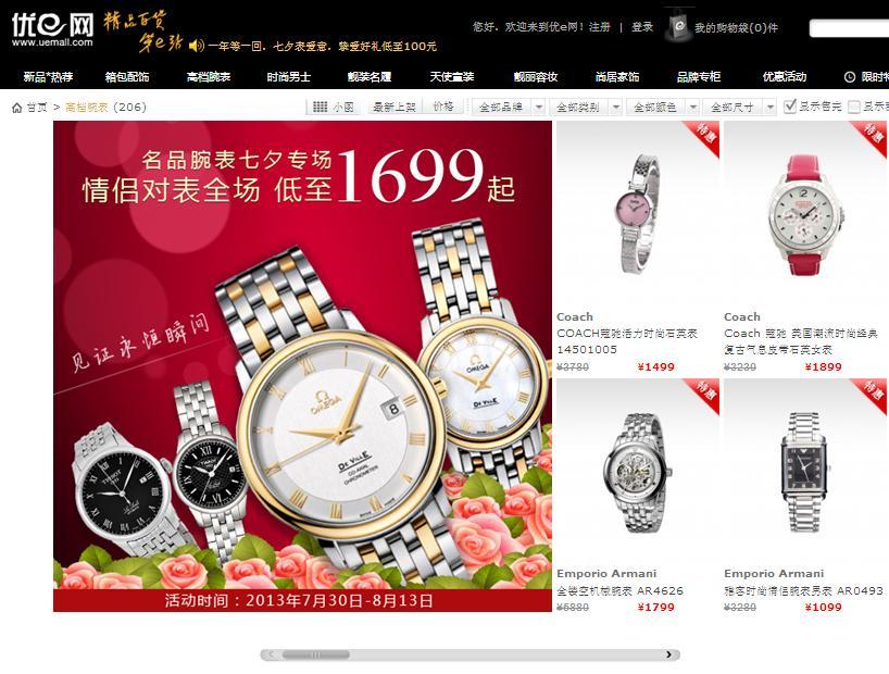 上海2013年8月1日電 /美通社/ -- 中國的情人節(jié)即將到來,為了讓所有情侶在七夕節(jié)有一個難忘的回憶,優(yōu)e網(wǎng)精選出百余款新品讓利回饋新老朋友。參加此次促銷活動的品牌涉獵品類有對表、包包配飾、家居、美妝等。本季較大亮點莫過于大牌情侶表的火熱上線,有Emporio Armani、浪琴、Tissot、歐米茄等,其中Emporio Armani情侶對表的促銷價格僅有1699元,更多情侶表也以優(yōu)惠的價格呈現(xiàn),大氣簡約的風(fēng)格和特質(zhì)亦是辦公白領(lǐng)和情侶所鐘愛的。送一款禮重情也重的定情信物,定能讓TA時刻感受到你的愛意。