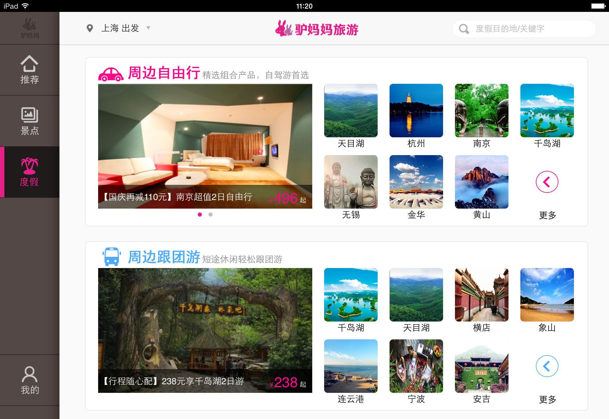 用戶視覺體驗的提升也是本次驢媽媽iPad版客戶端的亮點之一。該客戶端在視覺上針對蘋果產品高清Retina屏顯進行了深度優(yōu)化,全面支持2048x1536像素分辨率,當用戶點擊進入iPad界面后,將感受到來自高清像素沖擊下的視覺享受,將旅游產品的查詢與預訂感受趨向立體化、形象化。