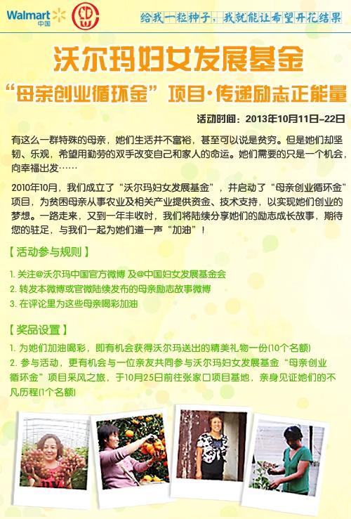 深圳2013年10月14日電 /美通社/ -- 近日,沃爾瑪中國(guó)在官方微博(@沃爾瑪中國(guó)官方微博,http://weibo.com/wmcsr)上線“為創(chuàng)業(yè)母親喝彩,傳播勵(lì)志正能量”慈善主題活動(dòng),講述在沃爾瑪“母親創(chuàng)業(yè)循環(huán)金”項(xiàng)目幫助下,貧困母親的勵(lì)志創(chuàng)業(yè)故事;并號(hào)召網(wǎng)友參與互動(dòng),為這些通過(guò)辛勞改變自己和家人命運(yùn)的母親們喝彩。網(wǎng)友參與微博活動(dòng),即有機(jī)會(huì)贏取精美禮物,還有可能被選中參與沃爾瑪“母親創(chuàng)業(yè)循環(huán)金”項(xiàng)目采風(fēng)之旅,前往張家口項(xiàng)目基地,見(jiàn)證創(chuàng)業(yè)母親的成長(zhǎng)歷程。