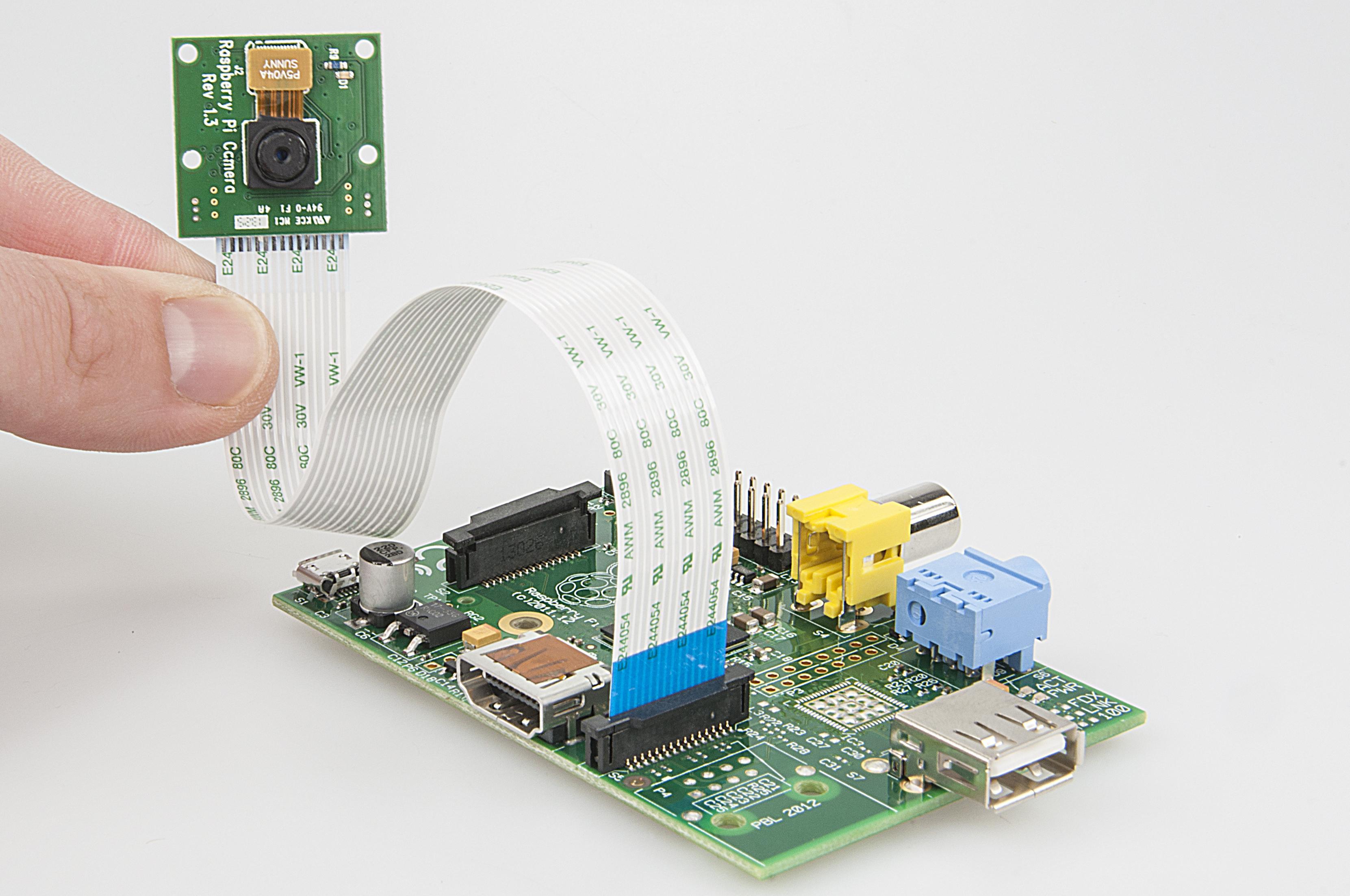 樹莓派A型板為矮版,信用卡大小,含256MB RAM、一個USB端口,無以太網(wǎng)連接。相機(jī)模塊僅有25mm x 20mm x 9mm大小,重量略大于3克,包含一個500萬像素CMOS傳感器,能夠拍攝2592 x 1944像素的靜態(tài)圖像,同時支持1080p(30fps)、720p(60fps)和640x480p(60或90fps)視頻拍攝。相機(jī)模塊通過一條短排線連接到樹莓派A型板,并采用CSI和I2C進(jìn)行控制。