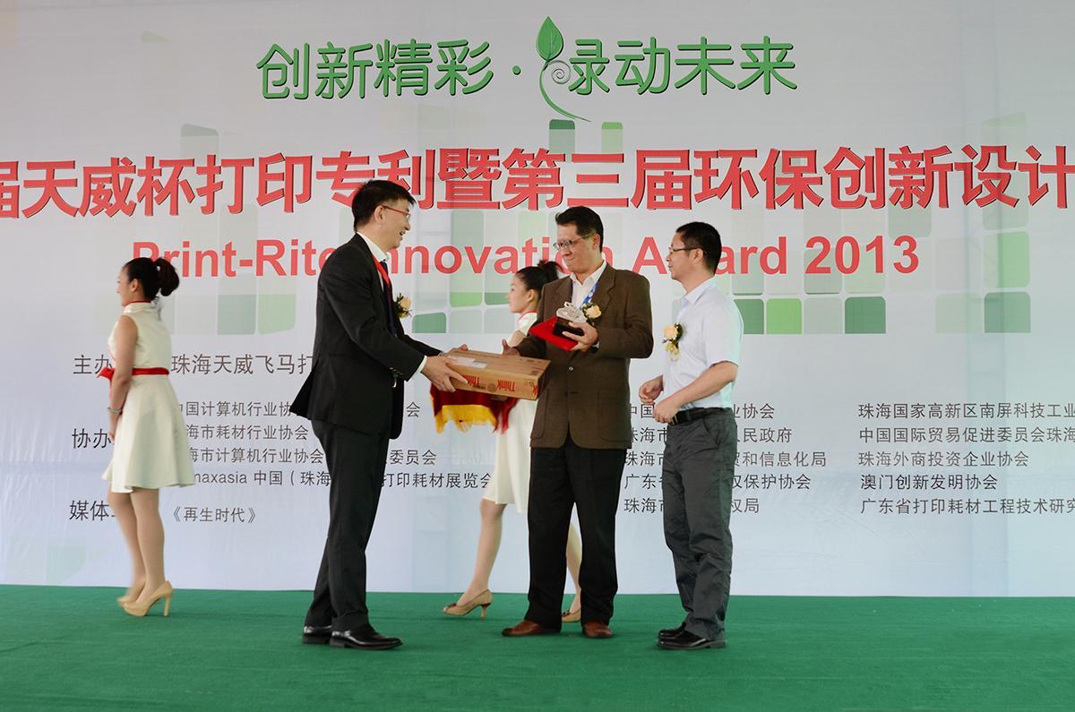 珠海2013年10月21日電 /美通社/ -- 10月17日,以“尊重知識(shí)產(chǎn)權(quán),推動(dòng)自主創(chuàng)新,共贏綠色經(jīng)濟(jì)”為宗旨的2013年第七屆“天威杯”打印專(zhuān)利暨第三屆環(huán)保創(chuàng)新設(shè)計(jì)大賽頒獎(jiǎng)典禮在中國(guó)國(guó)際打印耗材展覽會(huì)現(xiàn)場(chǎng)隆重舉行。5件打印專(zhuān)利作品分獲各類(lèi)“專(zhuān)利獎(jiǎng)”,6個(gè)對(duì)推動(dòng)通用耗材發(fā)展具有卓越貢獻(xiàn)的政府機(jī)構(gòu)、企事業(yè)單位榮膺各類(lèi)“美麗中國(guó)-綠色行動(dòng)公益獎(jiǎng)”。