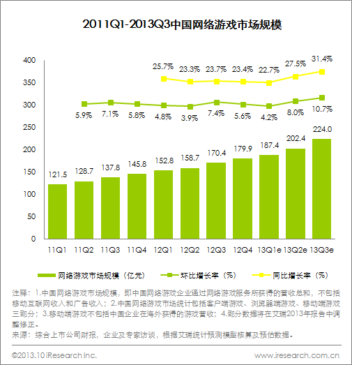 北京2013年11月19日電 /美通社/ -- 2013Q3網絡游戲市場規(guī)模達到224.0億元,同比增長41.4%、環(huán)比增長10.7%;移動游戲市場規(guī)模達35.7億元,同比增長75%。