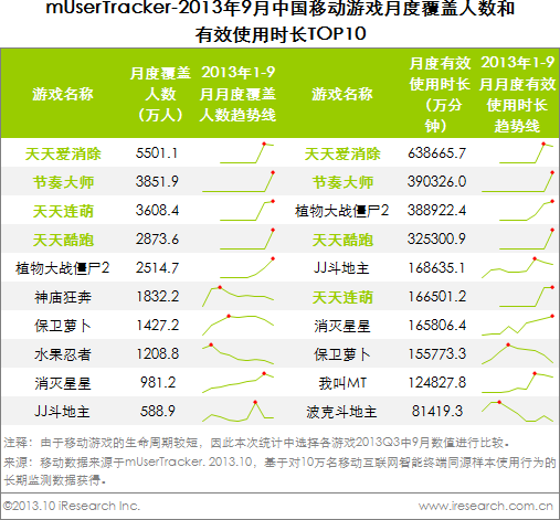 從2013年9月移動游戲月度覆蓋人數和使用時長榜單中可以看到,2013Q3成為騰訊移動游戲的天下,特別是微信平臺對于用戶的吸引巨大,從8月5日《打飛機》和《天天愛消除》在微信5.0 iOS平臺首推,短短兩個月時間已經占據用戶覆蓋和使用時長前列,社交平臺本身的用戶黏性及社交屬性對于輕度游戲用戶的吸引力較強。另外9月Android平臺首發(fā)的《植物大戰(zhàn)僵尸2》也獲得了大量用戶,并且人均使用時長相比其他游戲更高。