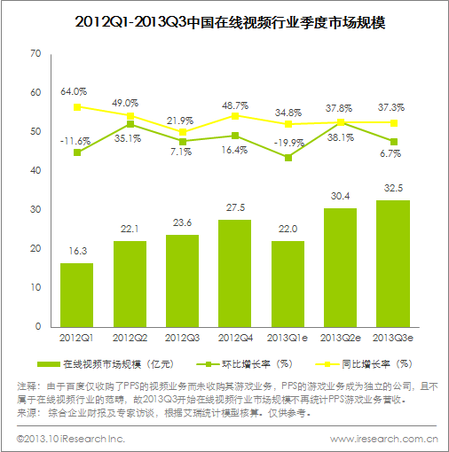 2013Q3,中國(guó)在線視頻行業(yè)市場(chǎng)規(guī)模達(dá)32.5億元,同比增長(zhǎng)37.3%,環(huán)比增長(zhǎng)6.7%。由于在線視頻市場(chǎng)規(guī)模最主要來(lái)自于廣告收入,受季節(jié)性因素影響,每年第一季度是廣告營(yíng)收規(guī)模的低谷,從而拉高了第二季度環(huán)比增長(zhǎng)率,以致于第三季度環(huán)比增長(zhǎng)率有較多下滑。