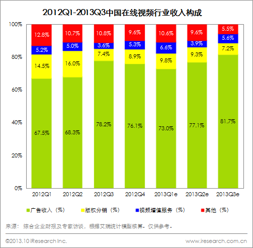 2013Q3,在線視頻行業(yè)營(yíng)收份額較高的業(yè)務(wù)類型依然是廣告,其占比高達(dá)81.7%,分別較2013Q2和2012Q3上漲4.6個(gè)和3.5個(gè)百分點(diǎn)。