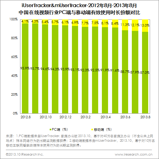 2013年8月,在線視頻移動(dòng)端的有效使用時(shí)長(zhǎng)份額為13.0%,三倍于2012年8月的4.1%。
