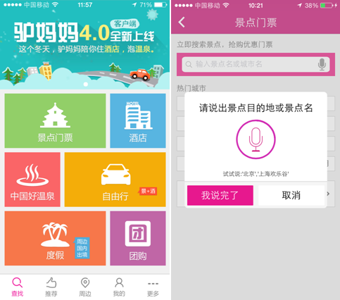 值得一提的是,本次驢媽媽旅游網(wǎng)手機(jī)客戶端4.0版還創(chuàng)新性地推出了特色頻道“語(yǔ)音搜索”。區(qū)別于以往用戶只能使用鍵盤或者手寫輸入的方式訂購(gòu)旅游產(chǎn)品,驢媽媽新版手機(jī)客戶端的“語(yǔ)音搜索”功能將給用戶帶來全新的搜索體驗(yàn)。用戶只需對(duì)著手機(jī)說出景點(diǎn)目的地或景點(diǎn)名稱、旅行或度假目的地等關(guān)鍵字,便可以輕松地獲得所需要的旅游資訊,將個(gè)性化和人性化的服務(wù)應(yīng)用于移動(dòng)客戶端。