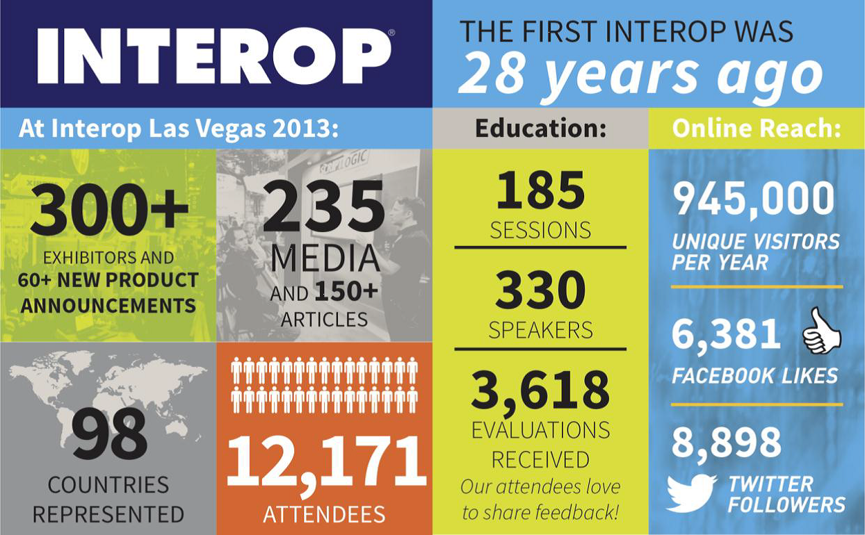 Interop Las Vegas是由全球第二大展覽公司UBM Tech 主辦的全球較大的網(wǎng)絡(luò)通信展會(huì)之一,距今已有28 年歷史。Interop 每年都吸引來自全球的數(shù)百家展商及專業(yè)媒體參與其中,分享最新的網(wǎng)絡(luò)通信業(yè)界動(dòng)態(tài)。其中,Interop Las Vegas 2013 的參展商超過了350 家,主辦方邀請到330 位全球知名演講嘉賓共帶來185 場精彩演講,另外,來自98 個(gè)國家的12171 名與會(huì)者以及235 家專業(yè)媒體參與活動(dòng)現(xiàn)場。Interop已經(jīng)成為業(yè)界公認(rèn)獲取關(guān)于最新 IT 趨勢及更好見解的高效平臺,關(guān)鍵技術(shù)伙伴以及各行業(yè)市場參與者能獲得所需的合適解決方案。