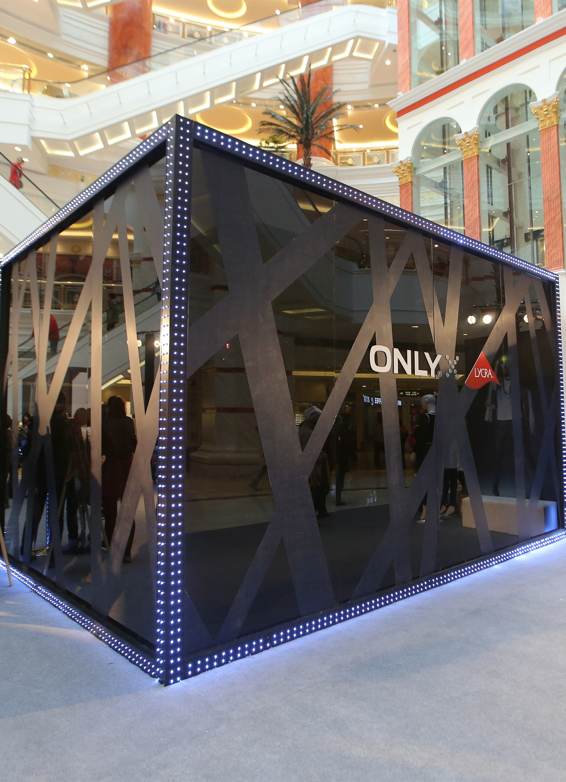 你是否能想象在“眾目睽睽”之下?lián)Q上心愛的彈性牛仔褲?這需要的不僅僅是勇氣,更是一副好身材。如果你有膽子又有“料”,那由ONLY和LYCRA®(萊卡®)纖維共同呈現(xiàn)的“透明試衣間”絕對是為你量身定制。占地約10平米的玻璃大盒子里陳列著的是由ONLY提供的最新款特別版牛仔褲,只要你敢于出眾,進入透明試衣間親自試穿,即可獲得心儀牛仔褲一條!不過別擔心,雖說是“透明”,在這個“玻璃大盒子”里試衣的你可以看到活動現(xiàn)場人頭攢動,但在外面的人卻窺探不到一點盒內的蛛絲馬跡。在透明試衣間中,百位通過微博、微信報名參與挑戰(zhàn)的時尚女性,打破常規(guī)思維禁錮在“透明空間”盡情試穿各色牛仔褲,讓身體享受超F(xiàn)it但又毫無束縛的LYCRA®(萊卡®)牛仔體驗。此外,所有參與挑戰(zhàn)透明試衣間的女性均可免費獲得牛仔褲一條,現(xiàn)場更有專屬的造型師與化妝師為其打造不同的時尚牛仔造型,并邀其成為拍片主角,由專業(yè)攝影師記錄下這一時尚的萊卡® x ONLY牛仔體驗派對時刻。