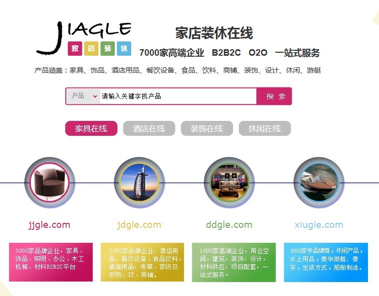 家店裝休網(wǎng)(http://www.jiagle.com)是博華深度整合公司旗下家具FUR、酒店HOTELEX、建筑裝飾裝潢設(shè)計(jì)Design & Deco、休閑/游艇Boat & Lifestyle 四大板塊線上展會(huì)和線下B2B網(wǎng)站資源而建立的集B2B2C和O2O為一體的一站式在線貿(mào)易采購平臺(tái)。其分設(shè)的家具在線JJGLE,酒店在線JDGLE,裝飾在線DDGLE和休閑在線XIUGLE為7000家高端企業(yè),近20萬專業(yè)觀眾及需要大批量采購各類中高端酒店用品、家具家居、配套裝飾解決方案、休閑產(chǎn)品的酒店、餐廳、商業(yè)地產(chǎn)、網(wǎng)店店主等提供線上對(duì)口產(chǎn)品的搜索、查詢、咨訊、交易和配套增值服務(wù)。