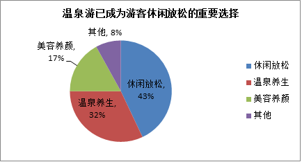 溫泉游已迎來了發(fā)展的黃金期,據(jù)驢媽媽相關(guān)調(diào)查顯示,超過43%的游客將溫泉游作為休閑放松的首選目標(biāo)、32%的游客青睞于溫泉養(yǎng)生、17%的游客選擇美容養(yǎng)顏、8%的游客選擇其他。由此可見,休閑放松已成為游客選擇溫泉游的重要目的。